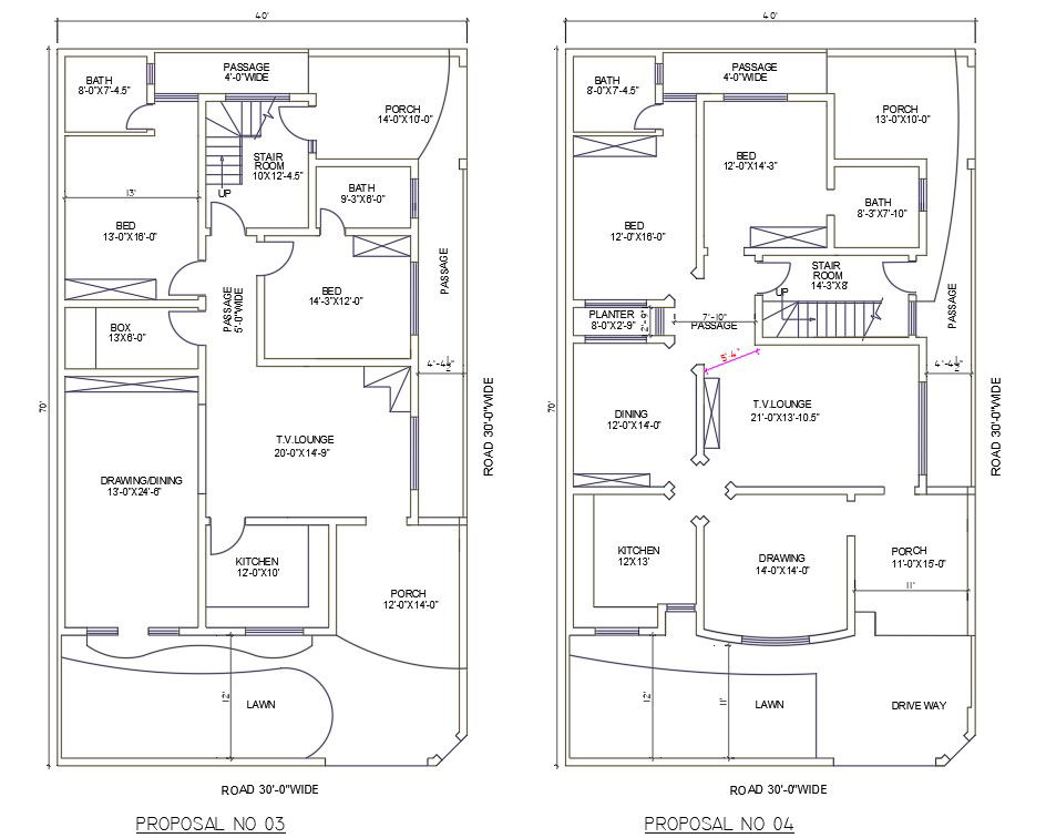 DWG AutoCAD file shows 40'X70' two Various types of 2 BHK House plan Drawings. In all two plans building area is the same, room allocation and room sizes vary. In all plans master bedroom with attached toilet, Drawing room, Kitchen, Dining, TV Lounge, porch, and Lawn are available. The Staircase is placed inside of the house. Download the AutoCAD Drawing file. Thank you so much for Downloading AutoCAD DWG 2d files from our website.