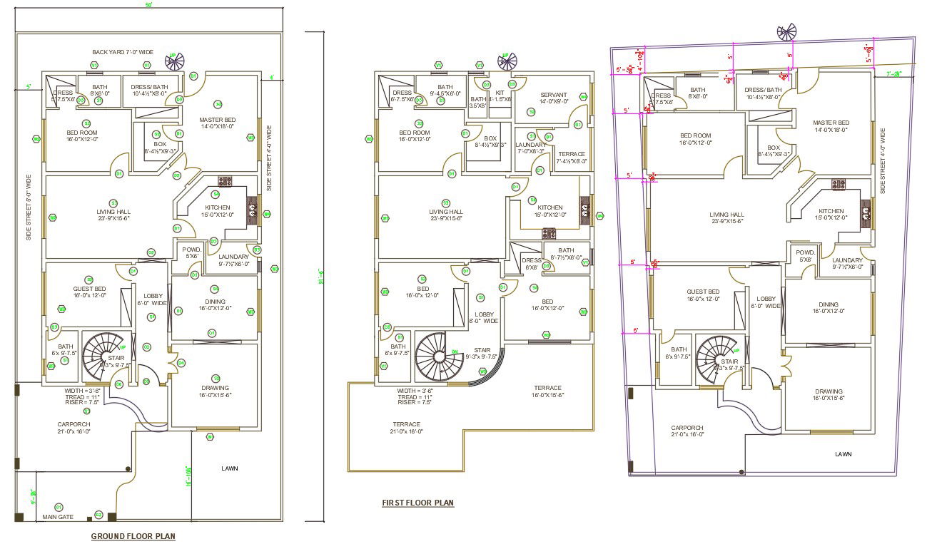 AutoCAD 2D Drawing file of 41'X67' 2BHK G+1 House plan layout. In this Plan the Ground floor having a master bedroom with an attached toilet, Kid's bedroom with an attached toilet, patio, Drawing room, Kitchen, Dining, TV Lounge, lobby, porch, and Lawn are available. On the first floor, rooms are also similar to the ground floor. The staircase is available inside the house. Download the AutoCAD Drawing file.