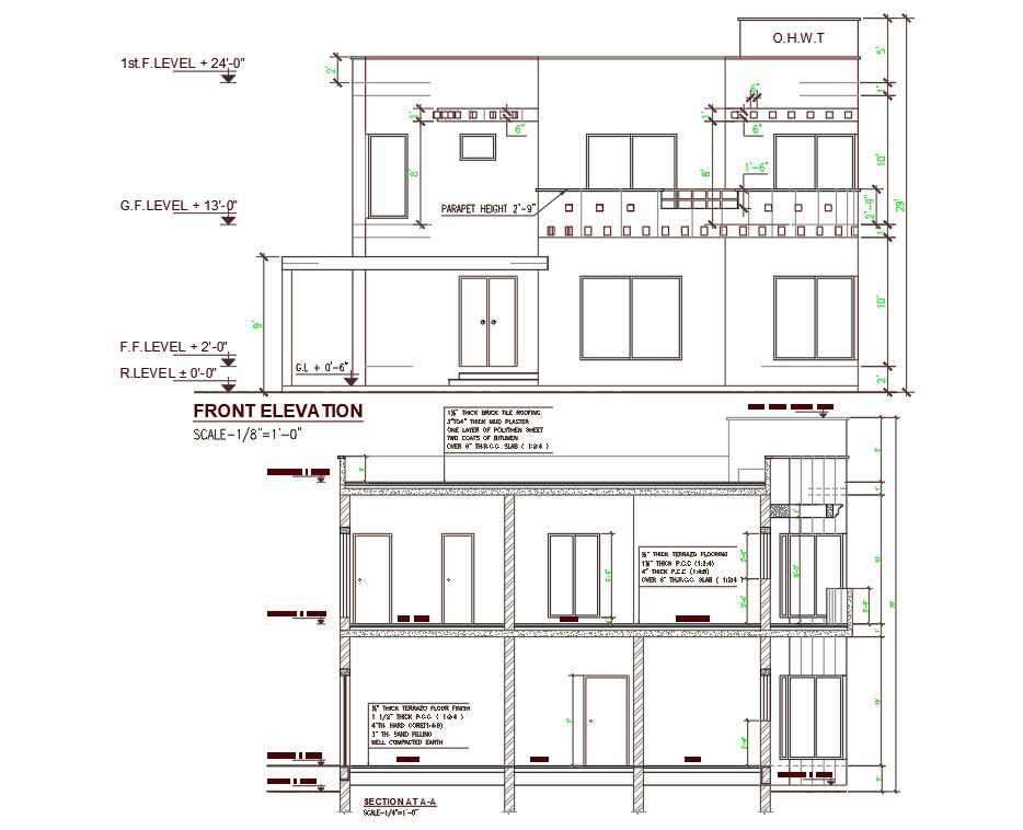 AutoCAD 2d CAD drawing of architecture double story house building section and elevation design. This drawing shows the front elevation and sectional details with dimension. Download the DWG file of house building drawing. Thank you so much for downloading AutoCAD DWG file from our website.