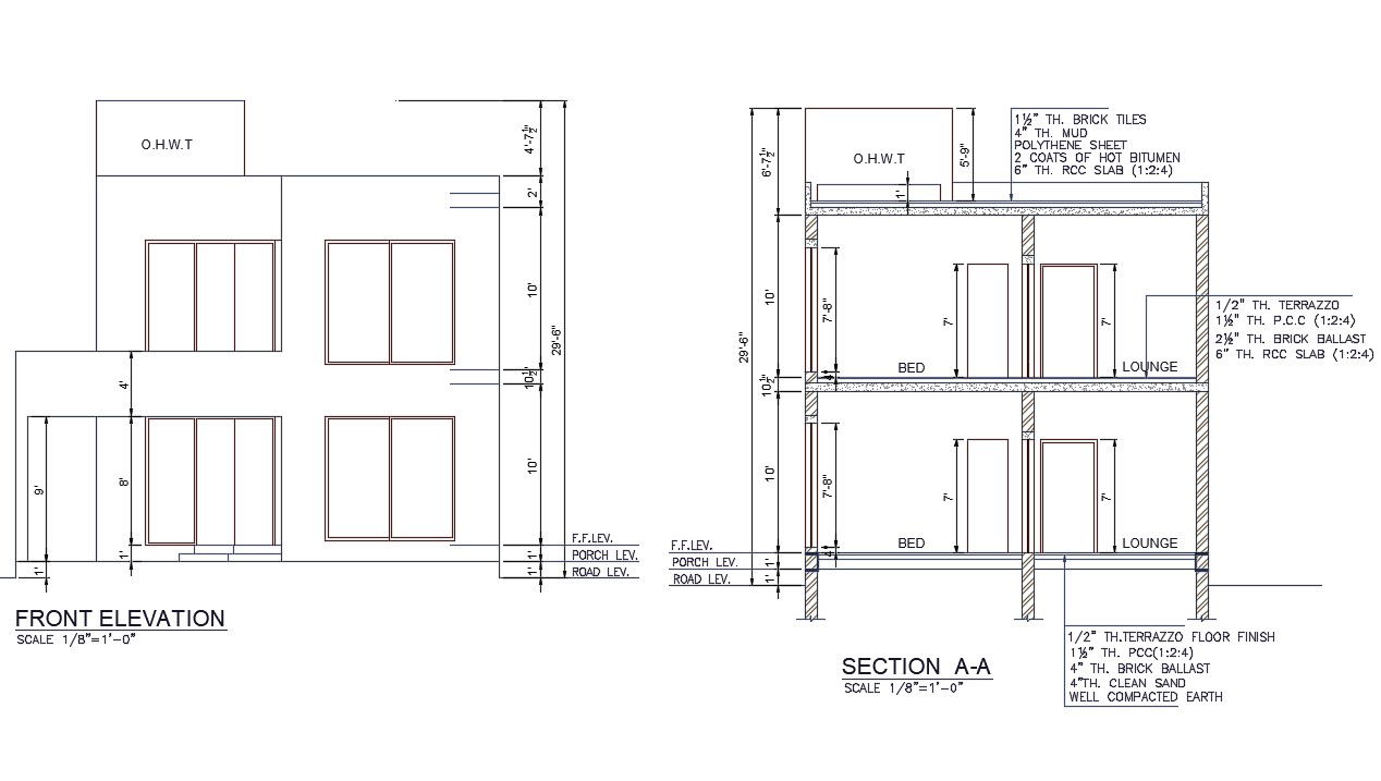 AutoCAD drawing file shows the Front Elevation and section details of the Single BHK G+1 house plan AutoCAD DWG file. Download the AutoCAD Drawing file.