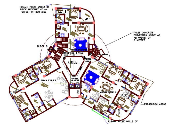 The luxurious apartment design source of inspiration whether you're looking for a new style project AutoCAD drawing has 3 BHK and 4 BHK plan with furniture drawing with doubble height floor plan there ara 3 different blocks construction detail 125mm false walls of brick masonry at an offset of 500 mm and false concrete projection above at an offset of 2 metres. Download luxurious apartment with concerns the interior design drawing DWG file