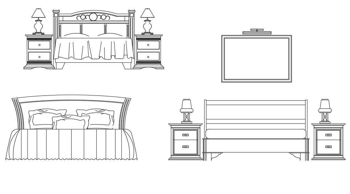 The wooden double bed front elevation design that shows headboard for resting against, and may have side rails and foot boards and mattress. this is old and stylish wooden double bed like king style. also has both side lamp table with drawer and electrical lamp design. download free double bed CAD blocks DWG file.