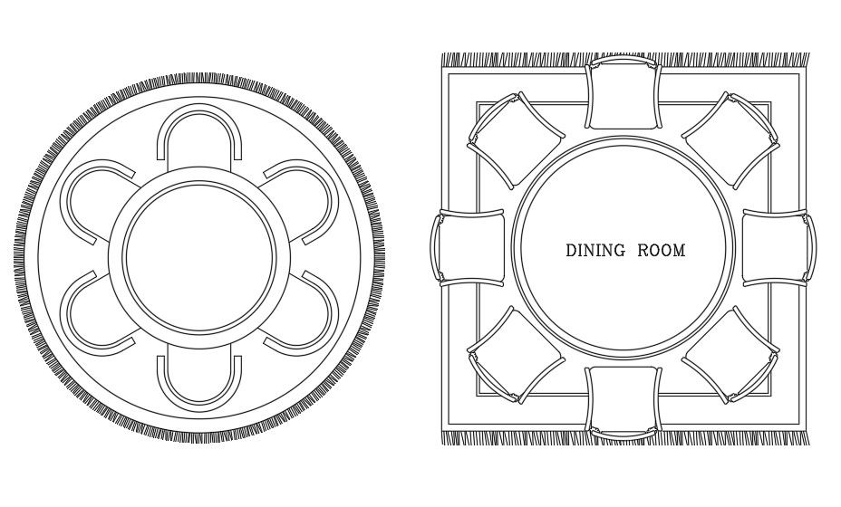 there are 2 latest round banquet table with 6 seater and 8 seater chair design. also has floor carpest for attracet the drawing. download free dining table furniture CAD blocks drawing which is use in dining area and and drawing room.