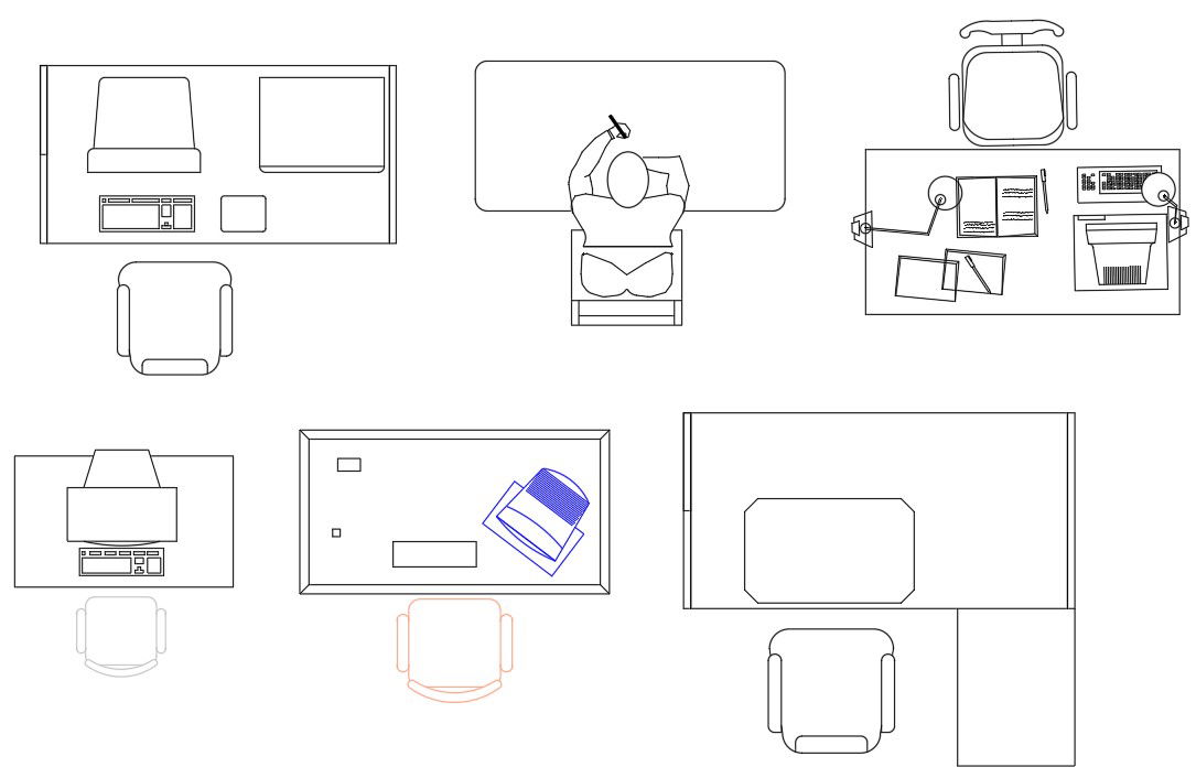 The office furniture CAD blocks drawing having detail of work desk that shows table and chair design which consist computer on table and chair for employes seat. download office furniture work desk table and chair CAD blocks top view plan DWG file.