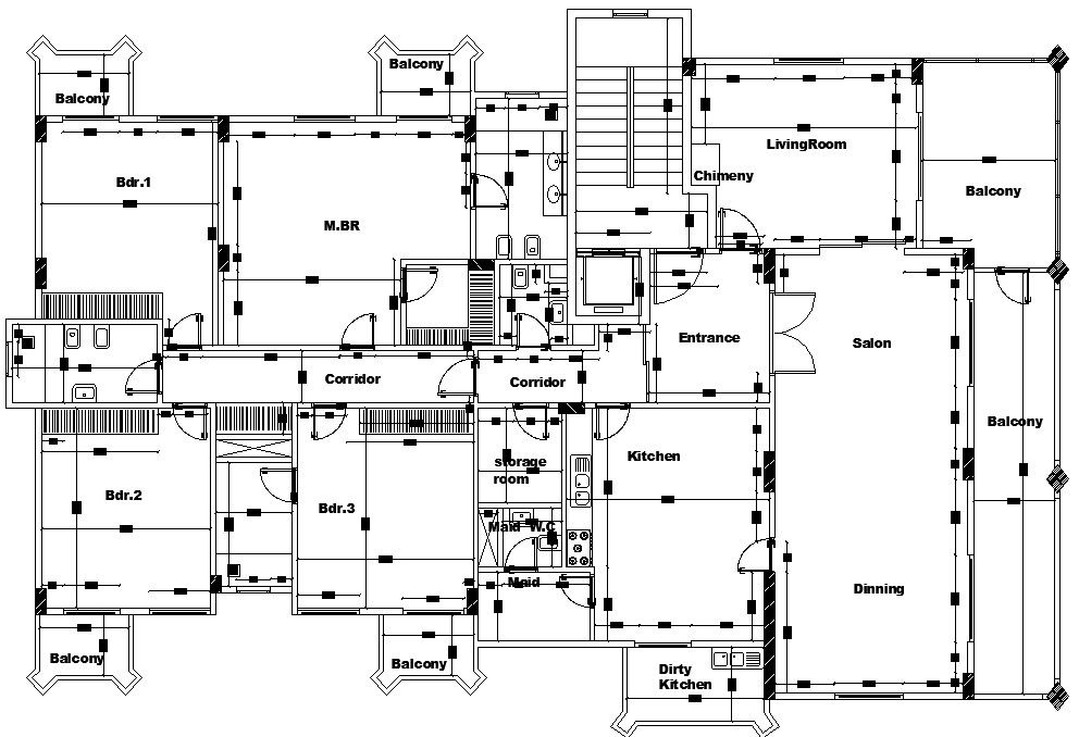 Four bedroom Luxury Ground floor House plan layout AutoCAD DWG file. In this house plan, the master bedroom with attached toilet, kid's bedroom with attached toilet, Guest with attached toilet, bedroom with attached toilet, Drawing room, Kitchen, Dining, TV Lounge, porch, balcony, salon, Maid room, and Lawn are available. The Staircase is placed inside of the house. Download the AutoCAD Drawing file.