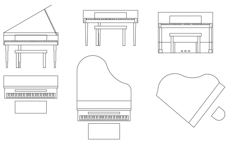 Musical Instrument grand piano CAD drawing shows all side elevation design view. this stringed musical instrument piano found in Italy 1700 year. download free the grand piano drawing free DWG file.