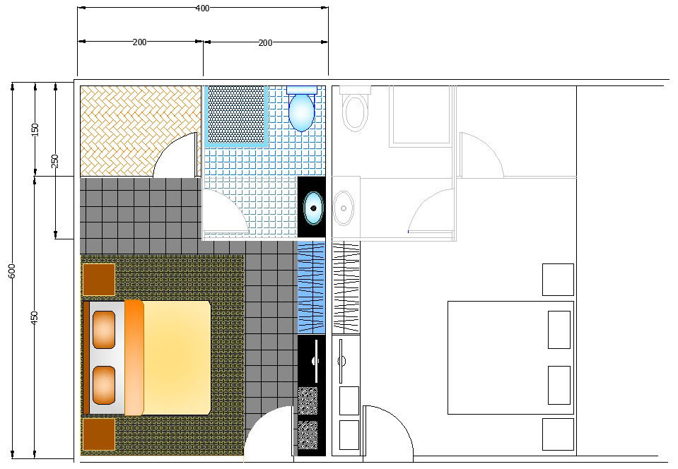 400X600mm Master bedroom with the attached toilet and attached balcony room furniture drawing, Interior design detail of bedroom and bed, television, western toilet , washbasin are the blocks given. Download Autocad DWG file. Thank you so much for downloading AutoCAD DWG file from our website.