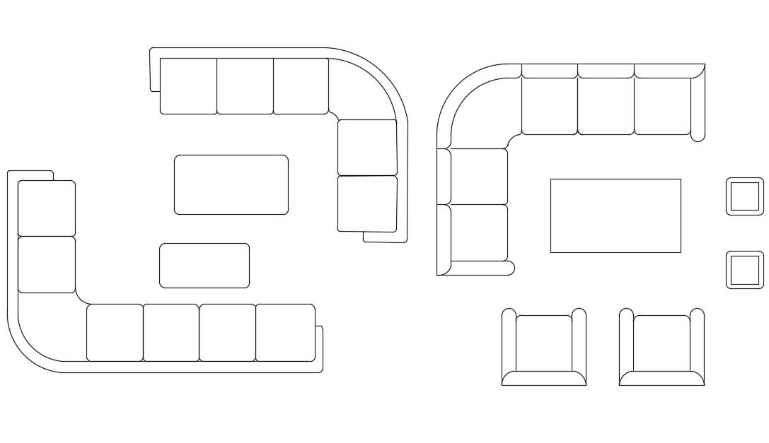 2d CAD blocks drawing of furniture set up for living room top view detail that shows L- shaped sofa set with center line table design. find here 2 different option of furniture blocks DWG file.