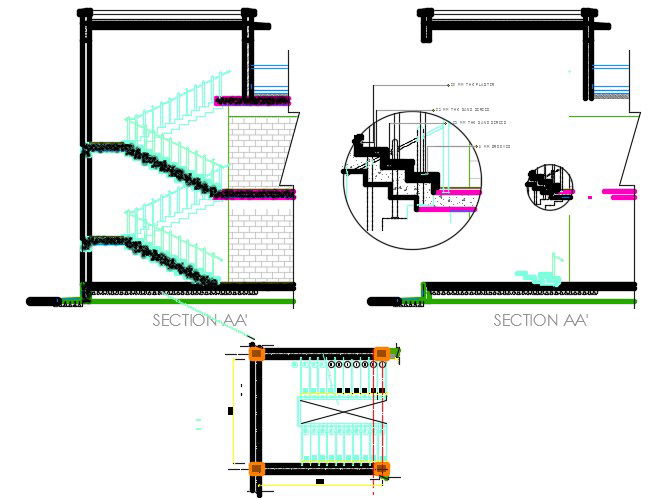 The residence 2 storey house staircase sectional elevation design which consist 20 MM THK plaster, 25 MM THK sand screed, and 6 MM grooves. also find here top view plan and side section with RCC slab design. Brick Masonry To Be Done In English Bond With 1:4 Cement Mortar Unless Other Specified. download staircase constriction detail DWG file.