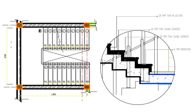 Download free CAD drawing of staircase construction top view plan and section drawing that shows 20 MM THK plaster, 25 MM THK sand screed, and 6 MM grooves with slab and railing design.