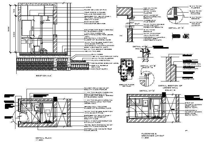 the toilet construction top view plan and section drawing with description detail which consist brick masonry to be done in english with 1:4 cement mortar unless otherwise specified, false ceiling of pvc, trap door in false, granite-kajaria for ledge wall. also has detail of towel ring, soap dish and tumbler holder of gravity make (porus). download toilet construction drawing DWG file.