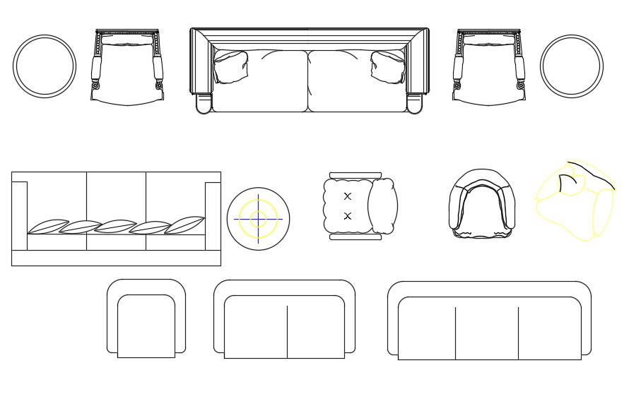 2d DWG Blocks of AutoCAD drawing having detail of sofa set furniture top view design which consist 1 seater, 2 seater and 3 seater. Download free DWG file of sofa set furniture blocks that use in drawing room, living lounge, and family room.