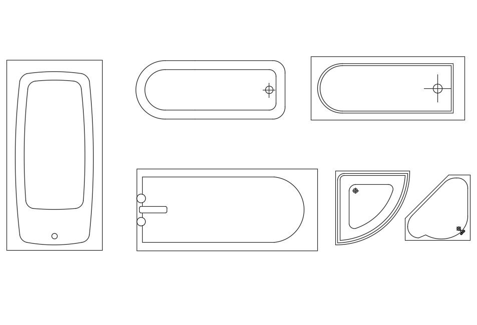 Download fre bathroom bath tub CAD blocks top view drawing that includes a detailed corner and wall attached different kind of bath tubs in different sizes and designs with drainage water hole and tap detail.