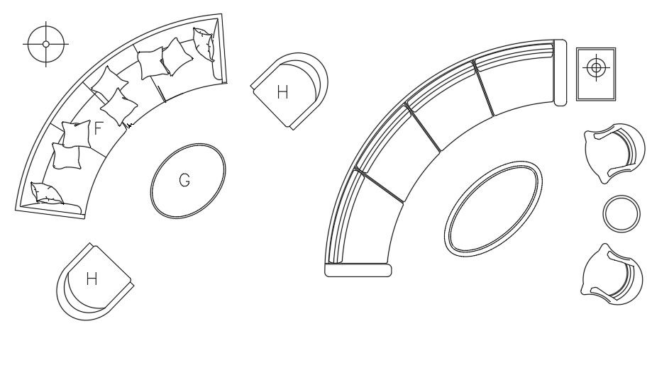 Two different types of curved sofa 2d Autocad furniture drawing. It contains various types of sofa and table block design. These blocks will be useful for interior designers. Download the AutoCAD drawing file. Thank you so much for Downloading the AutoCAD DWG 2d files from our website.