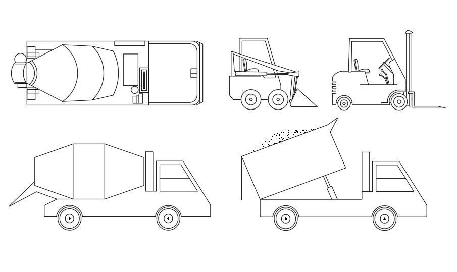 Different types of construction vehicles 2d design block Autocad drawing. Download the AutoCAD drawing file.