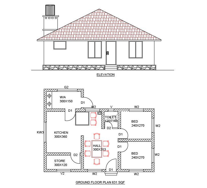 House Ground Floor plan 631 square feet plot size layout plan includes 2 bedrooms, toiet bathroom, hall, kitchen, store room and wash area with door and window marking detail. download architecture house plan with truss roof house building front elevation design PDF file.