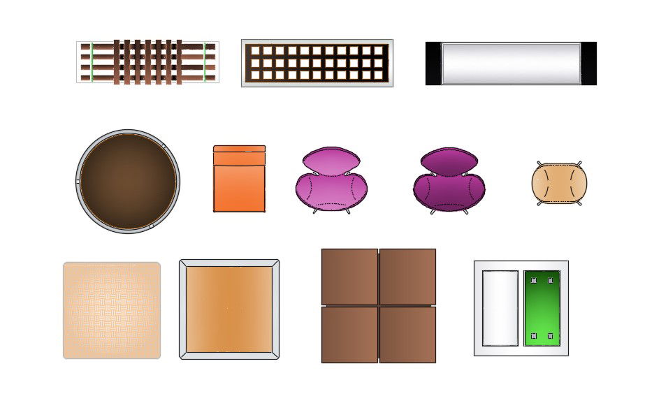 Download Free CAD drawing Furniture blocks top view which consist table, window, benches, and arm chair with AutoCAD hatching design for improve the CAD presentation.