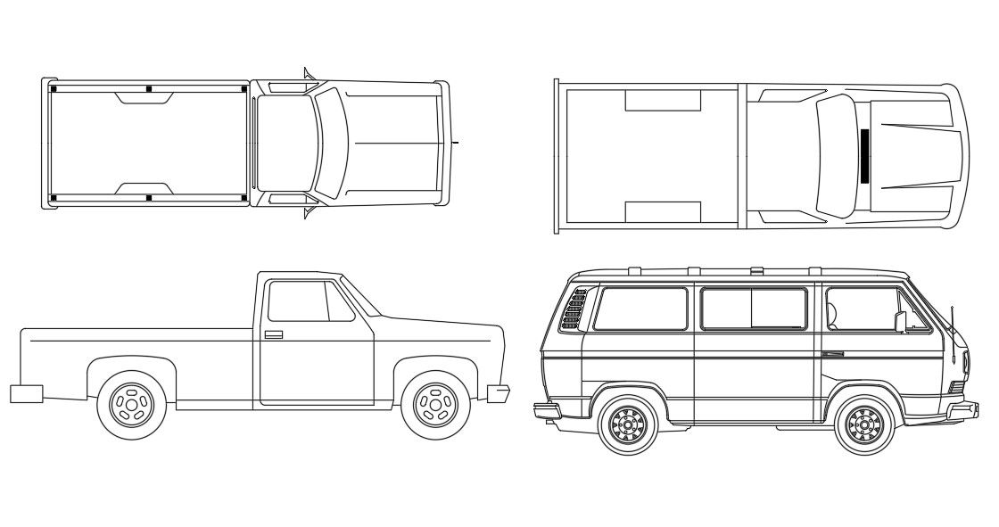 2D AutoCAD drawing of free CAD blocks shows top view plan, and front elevation design which shows van and mini transports good vehicle with diffident model design. download free vehicle CAD blocks DWG file.