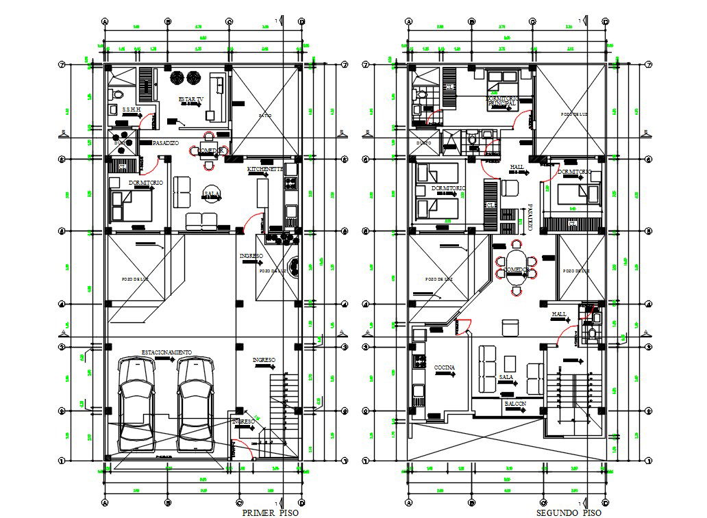 AutoCAD Drawing file of 9 X 18 meter plot size of 2 storey house plan with Interior furniture design. In this Plan the ground floor having a master bedroom with an attached toilet, kitchen, dining area, and 5 X 6 meter car parking porch. On the first floor has 3 bedrooms, hall, dining area, kitchen and drawing room with staircase design. the additional drawing such as a column layout with center line plan and dimension detail. download interior house project drawing DWG file.