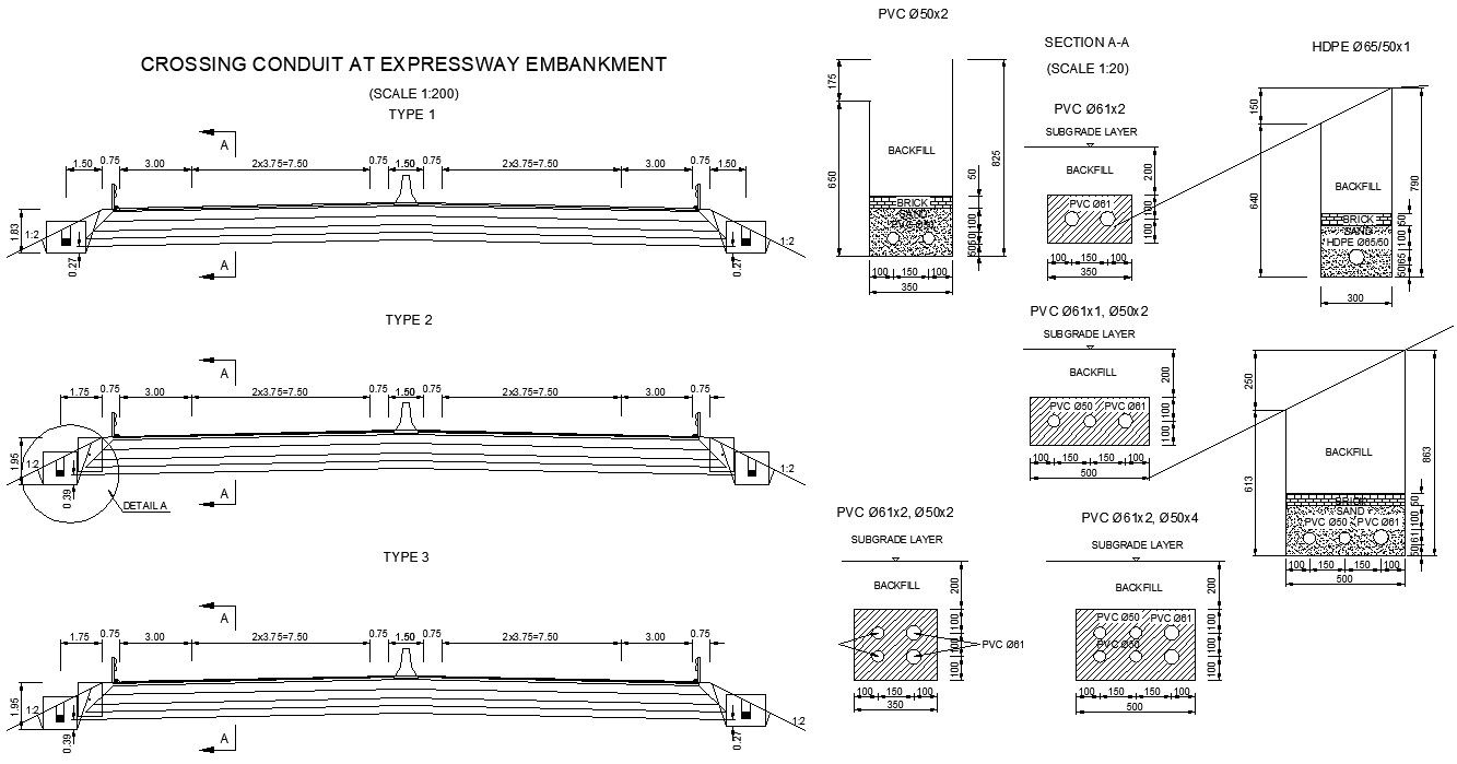 2D DWG file of the crossing conduit at expressway embankment section details. Download the AutoCAD DWG file.