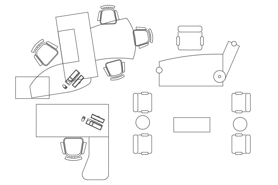 2d AutoCAD blocks drawing of office work desk table and chair top view plan with number of different design. download free office desk furniture blocks DWG use for library continues to grow your interior furniture CAD presentation.