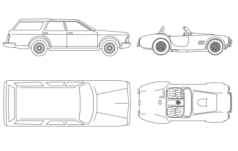 Find here 2 different Car CAD blocks top view and side elevation design that shows 2 seater open sports car and 4 seater long car vehicle CAD blocks free download DWG file.