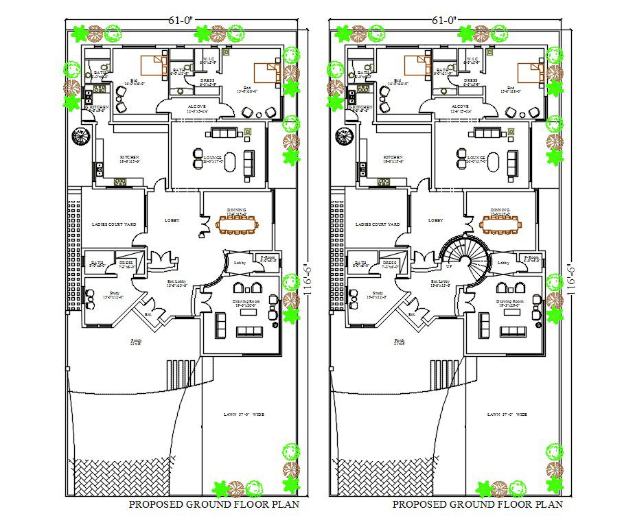 7100 Square feet Architecture house ground floor layout plan AutoCAD drawing having detail of 2 master bedroom with an attached toilet, 24'X17' wide lounge, kitchen, ladies court yard, lobby, dining area, entrance lobby, study room, drawing room, porch area, and 37' wide lawn with landscaping design. some additional detail such as a measurement and description. download purposed ground floor plan house project drawing DWG file.