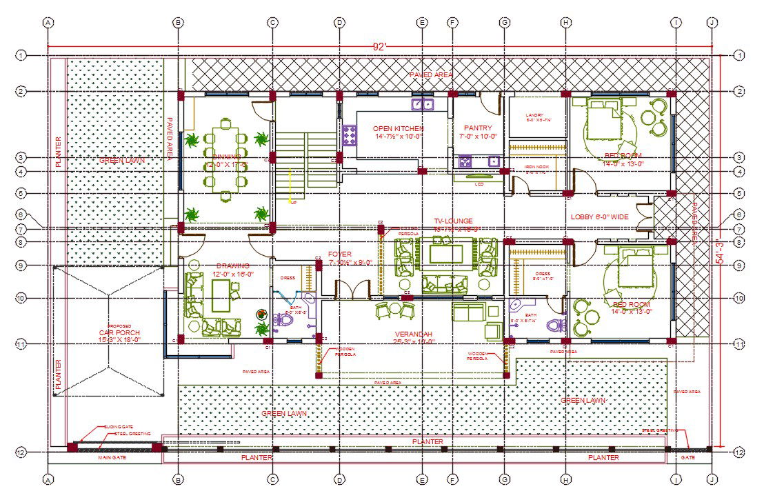 The architecture residence building ground floor layout plan for 55 X 92 feet plot size with center line all dimension detail which consist 14' X 13' bedrooms with an attached toilet, TV lounge, open kitchen, dining area, drawing room, foyer, inside staircase, out side green lawn and 15 X 18 feet car parking porch with veranda. also has additional details of door and window marking design. download 2 BHK large house layout plan drawing DWG file.