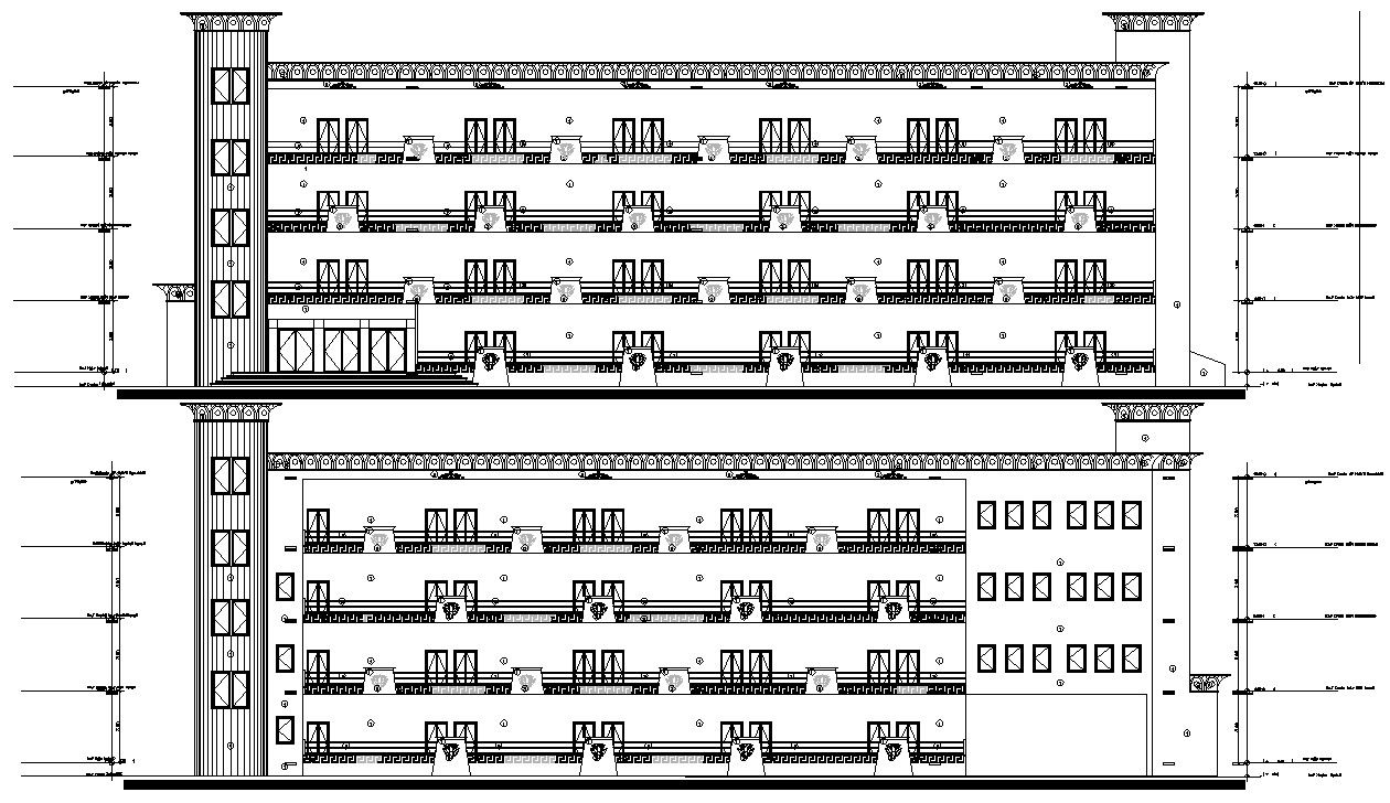 Row apartment building typical section and the elevation details of the DWG Drawing Autocad 2d file