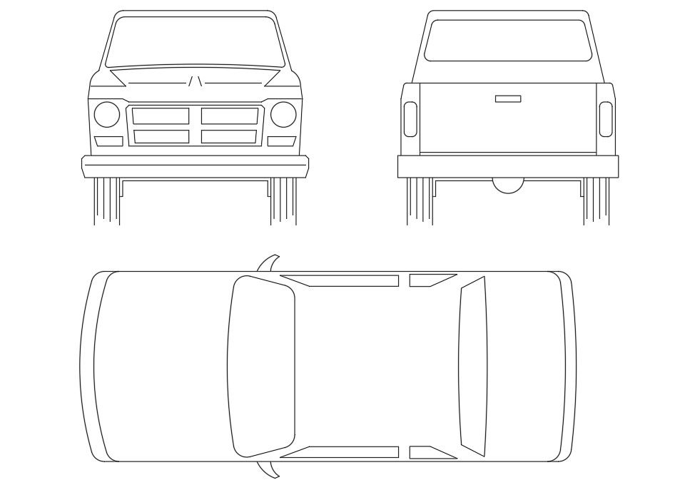 Download free 2d CAD blocks drawing of car top view, front and rear elevation design. this is 2 seater car that use in parking lot CAD presentation.
