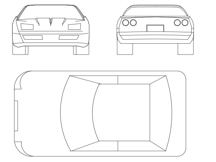 The powered motor of 2 seater sports car CAD blocks drawing that shows top view, front and rear elevation design which includes model, logo, and design. download advanced technology Sports car drawing CAD blocks DWG file.