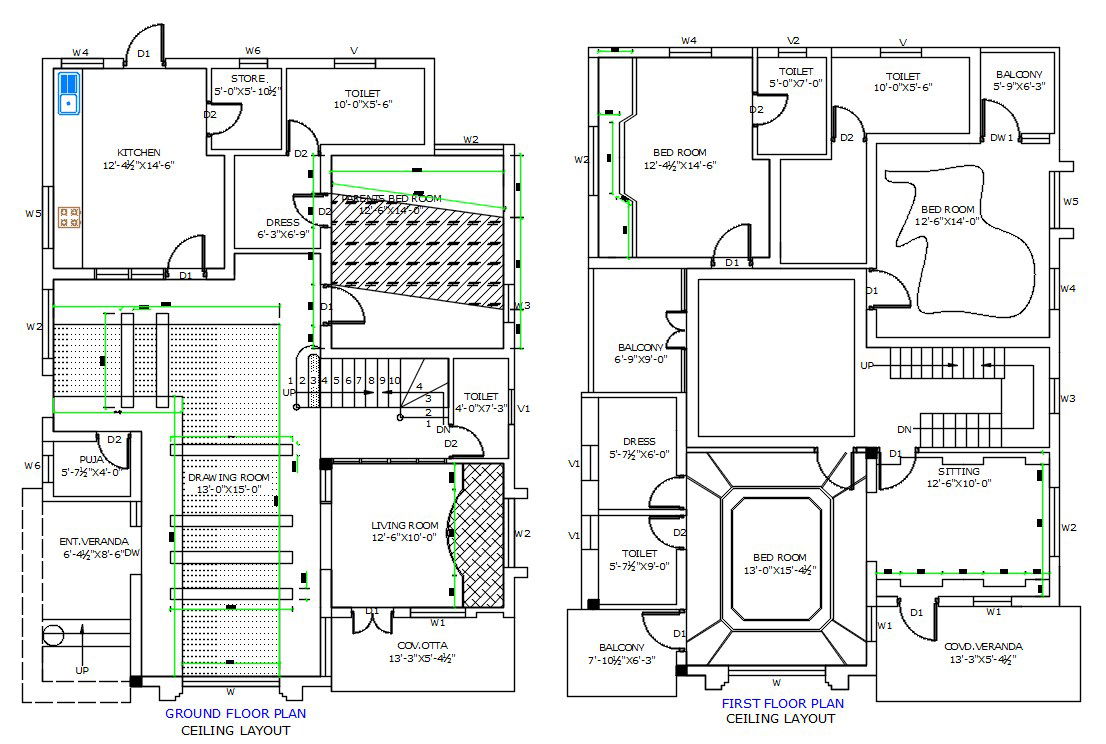 34' X 47' Architecture house ground floor and first floor layout plan with ceiling design AutoCAD drawing which consist 4 bedrooms with an attached toilet, kitchen, dining area, living room, 13'X15' drawing room, and balcony. the additional drawing such as a all measurement and description detail for easy to understand this project. download Modern 2 storey 4 BHK house plan with ceiling pop layout drawing DWG file.