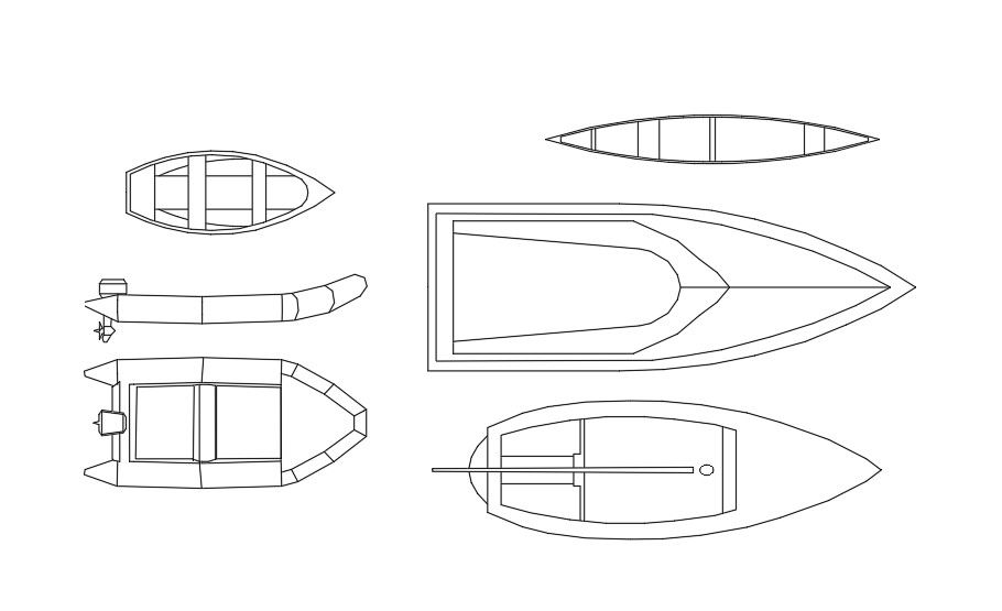 AutoCAD blocks drawing of different design and shaped of boat top view and side elevation design which includes hand boat and motor boat model design CAD blocks. download free AutoCAD blocks of water craft boat design DWG file.