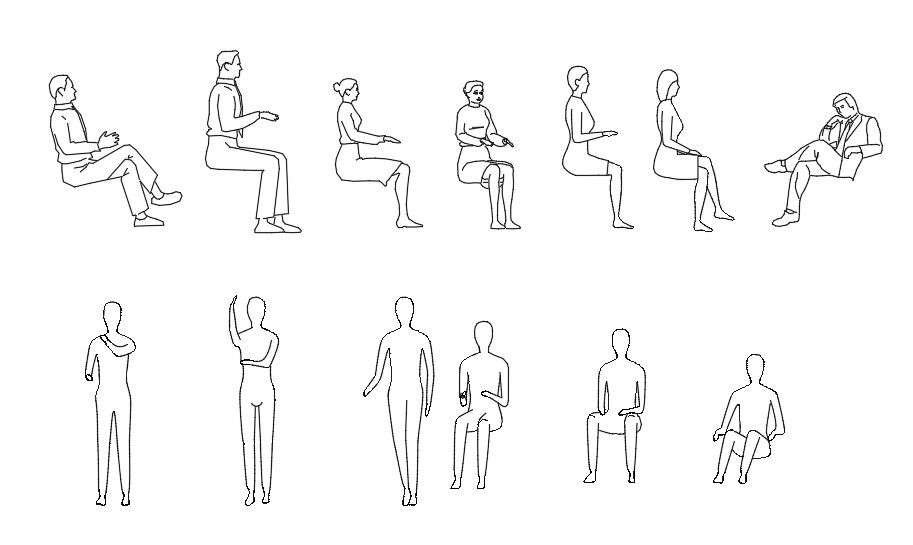 2d AutoCAD people blocks drawing DWG file which shows standing and seating people in different situation. Download free DWG file of people CAD blocks and use it for ,multipurpose CAD presentation.