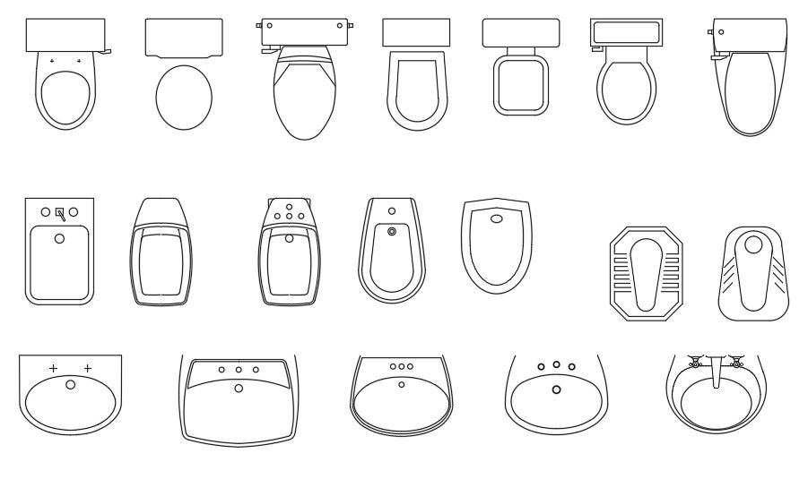 The sanitary ware AutoCAD blocks drawing water closet western style toilet and Indian style toilet, and wash basin top view that shows different model and size design. download free sanitary ware CAD blocks DWG file that use in bathroom project.