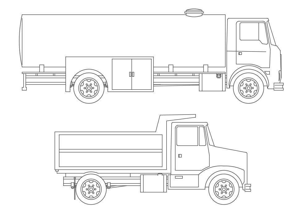 AutoCAD drawing of vehicle blocks drawing that shows 2 different dump truck and tanker truck side elevation design. download free transportation truck CAD blocks DWG file.