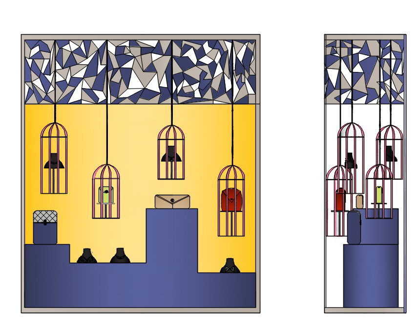 fancy show window design of bags and jewelry with cages . provided with cad drawing of front elevation, side elevation and top view #