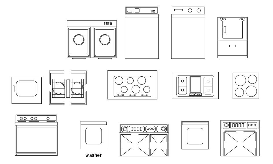 Download free AutoCAD drawing of electrical washing machine and 4 burner gas stove top view that shows in number of different size and design which is use in house CAD presentation.