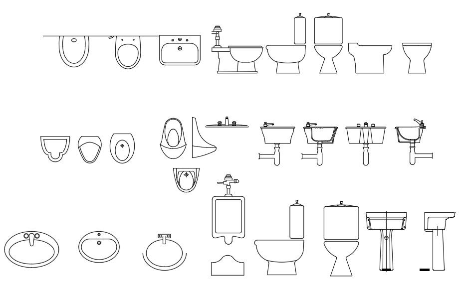 2d AutoCAD sanitary ware free CAD blocks drawing includes wash basin, toilet and urinal with front and side elevation design. download free hardware sanitary ware CAD blocks download DWG file.
