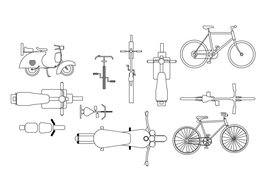 2d CAD blocks drawing of vehicle which includes scooter, bicycle, and motor bike top view and front elevation design with different model and shaped. download free 2 seater vehicle CAD blocks DWG file.