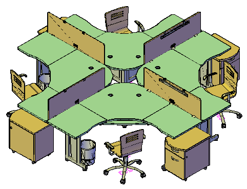 Office furniture workstation drawing "X" cluster.in this cluster 4 person sitting in that desk. with drawer pedestal storage mentioned in this drawing of 3D view.