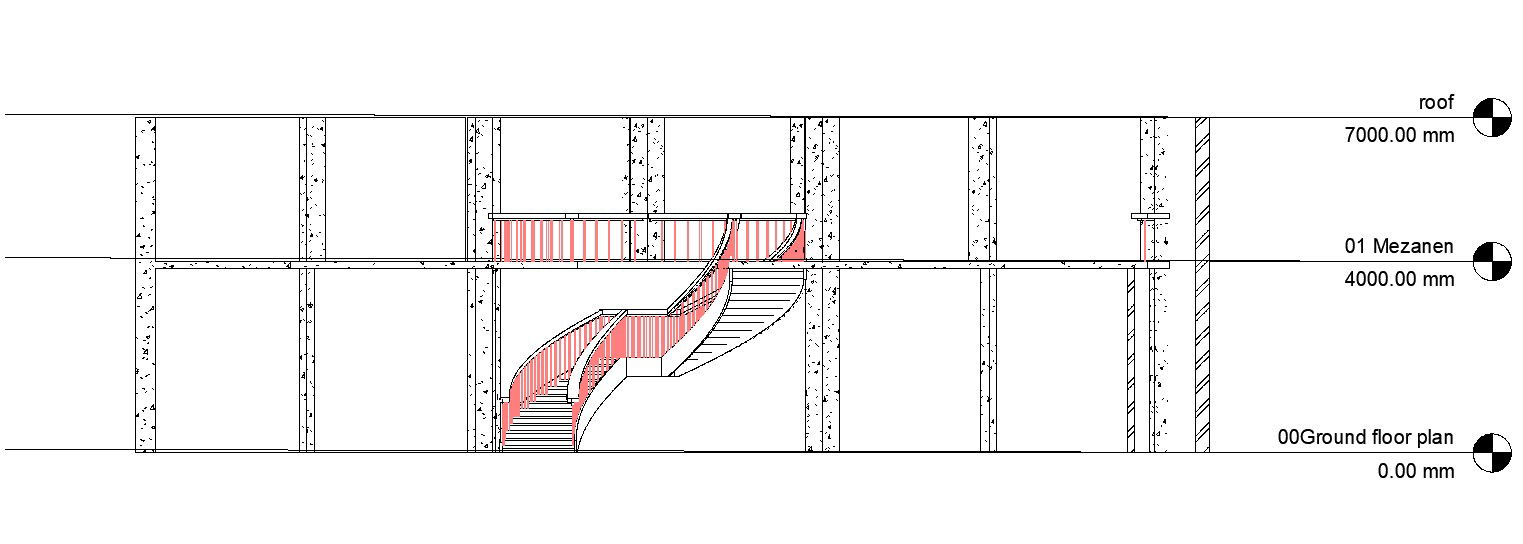 G+1 Shop building with center staircase section plan DWG file. Download the AutoCAD 2D DWG file.