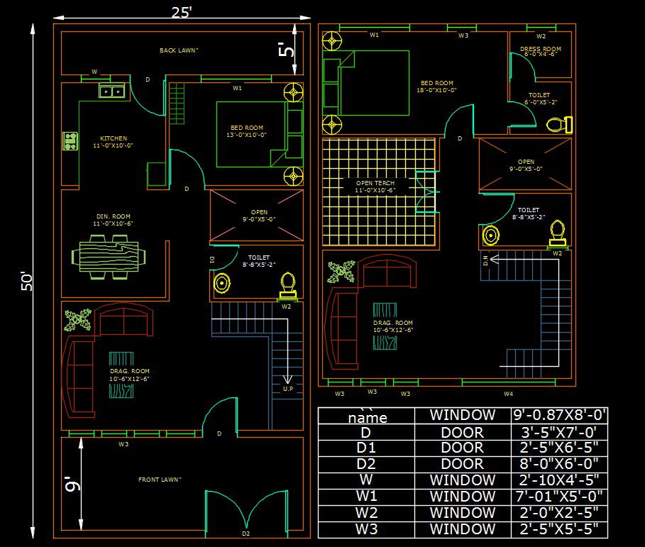 2d drawing in this place are available length is 25'X50' total area is 1125. 2 bedroom, kitchen, bath room, lobby open living area stair.