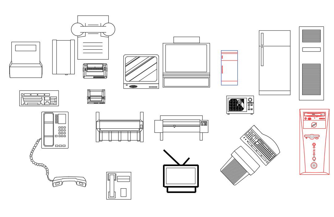 Free AurtoCAD drawing of electrical blocks that shows television, telephone, ATM machine, computer, fax, and oven which is use in electrical CAD presentation. download free electrical machine CAD blocks drawing DWG file.