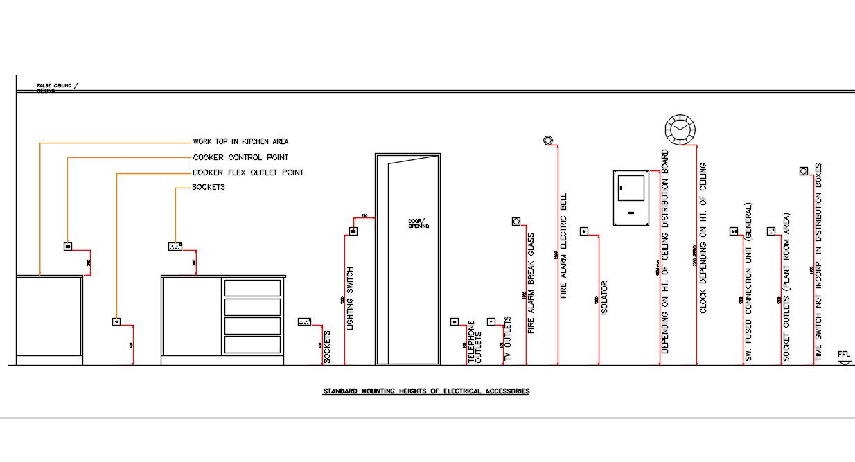 Detailed CAD drawing of electrical accessories heights in DWG format. Includes switches, sockets, panels, and fixture placement with precise measurements. Ideal for architects, interior designers, and engineers to plan and implement electrical layouts efficiently in residential, commercial, and industrial projects using AutoCAD.