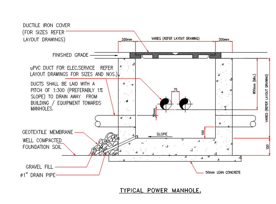 ductile iron cover (for sizes refer layout drawings) upvc duct for electrical.service refer layout drawings for sizes and nos.)ducts shall be laid with a pitch of 1:300 (preferably 1% slope) to drain away from building / equipment towards manholes. geotextile membrane well compacted foundation soil, gravel fill and drain pipe detail. download free electrical manhole drawing DWG file