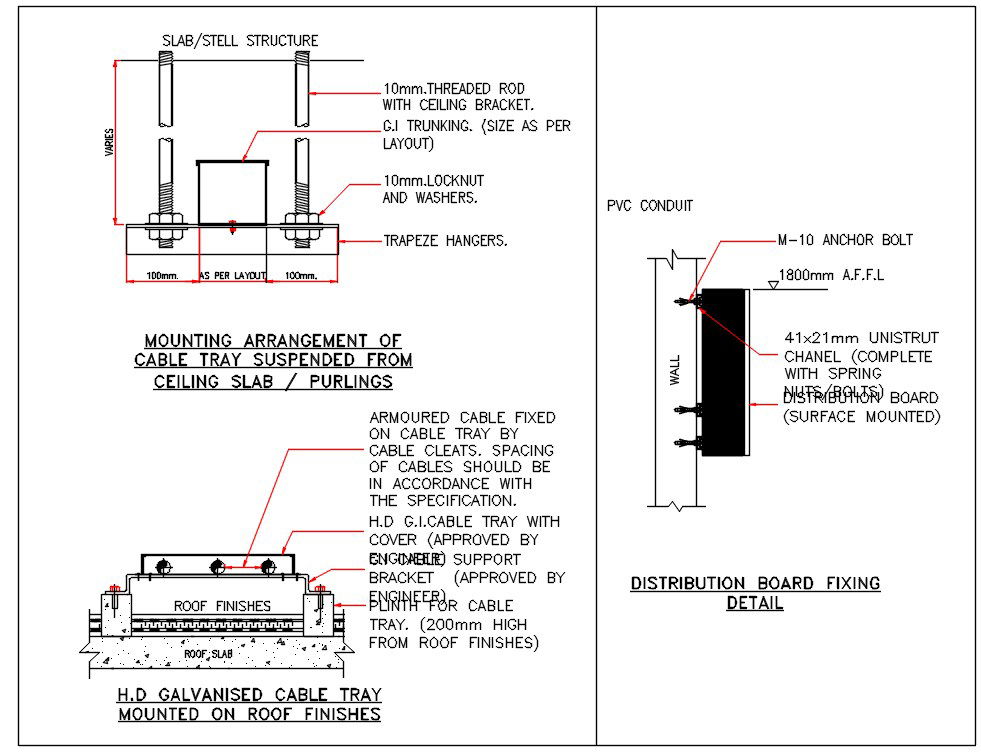 The Ceiling Mounted Cable Tray And Board Fixing Drawing includes mounting arrangement of cable tray suspended from ceiling slab / purlings and h.d galvanised cable tray mounted on roof finishes and distribution board fixing detail that shows 41x21mm unistrut chanel (complete with spring nuts/bolts) and armoured cable fixed on cable tray by cable cleats. spacing of cables should be in accordance with the specification with plinth for cable tray. (200mm high from roof finishes). download free electrical board distribution DWG file.