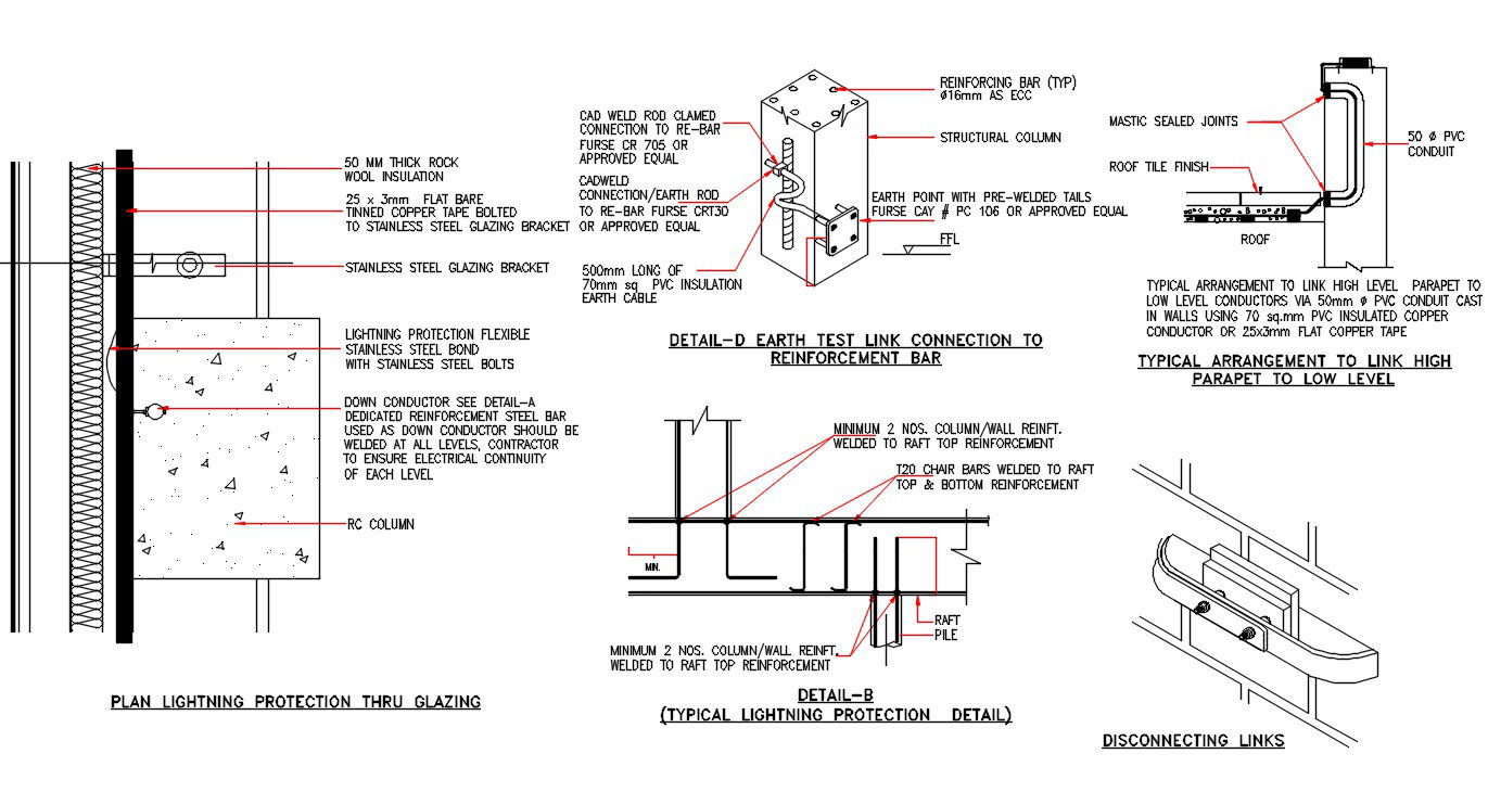 the earthing connection lighting protection cad drawing includes earth test link connection to reinforcement bar, typical earth points arrangements, disconnecting links for arrangement to link high parapet to low level, and earth point with pre-welded tails furse cay. the wires shall be left in all conduit runs for other services, that is between ahu's/fcu's and thermostats etc. and these should be in accordance with the drawings. download free earthing testing CAD drawing DWG file.