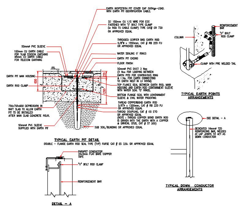 typical earth points arrangements detail CAD drawing includes down parapet conductor 25x3mm flat bare copper tape, reinforcing bar welded at lap joints to act as down conductor, earth pits for continuous ring and for earth connecting, bottom flange seal with containment sleeve & civil water proofing. 150mm cu earth cable for slab station earthing 95mm cu earth cable for telecom earthing then aster pit to be installed after main slab concrete pour. download free earthing point CAD drawing DWG file.