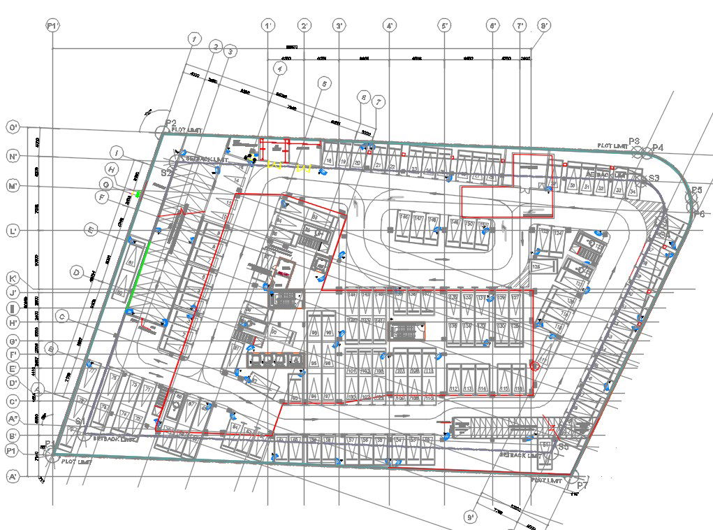 The Shopping Center Basement building basement plan CAD drawing recommendations of the consideration of a number of car significant requirements. also the calculations for the number of spaces 150 car to be provided to meet demand at peak times. alos has 4 lift and staircase facility, ramp down and up for entrance and exit from the mall. download Architecture basement parking plan CAD drawing DWG File.